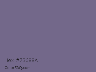 Hex #73688a Color is a normal indigo color and the nearest color is Rum #796989. Hex code #73688a and RGB value is rgb(115,104,138). In RGB color space, this color is composed of 45% red, 41% green, 54% blue, In CMYK color space, this color is composed of 17% cyan, 25% magenta, 0% yellow , 46% black , In HSL color space, this color has a hue angle of 259° , 14% saturation and 47% lightness.