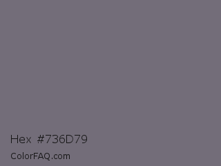 Hex #736d79 Color is a normal violet color and the nearest color is Fedora #796a78. Hex code #736d79 and RGB value is rgb(115,109,121). In RGB color space, this color is composed of 45% red, 43% green, 47% blue, In CMYK color space, this color is composed of 5% cyan, 10% magenta, 0% yellow , 53% black , In HSL color space, this color has a hue angle of 270° , 5% saturation and 45% lightness.