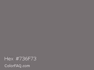 Hex #736f73 Color is a normal magenta color and the nearest color is Nickel #727472. Hex code #736f73 and RGB value is rgb(115,111,115). In RGB color space, this color is composed of 45% red, 44% green, 45% blue, In CMYK color space, this color is composed of 0% cyan, 3% magenta, 0% yellow , 55% black , In HSL color space, this color has a hue angle of 300° , 2% saturation and 44% lightness.