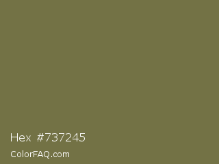Hex #737245 Color is a normal yellow color and the nearest color is Go Ben #726d4e. Hex code #737245 and RGB value is rgb(115,114,69). In RGB color space, this color is composed of 45% red, 45% green, 27% blue, In CMYK color space, this color is composed of 0% cyan, 1% magenta, 40% yellow , 55% black , In HSL color space, this color has a hue angle of 59° , 25% saturation and 36% lightness.