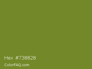 Hex #738828 Color is a normal lime color and the nearest color is Wasabi #788a25. Hex code #738828 and RGB value is rgb(115,136,40). In RGB color space, this color is composed of 45% red, 53% green, 16% blue, In CMYK color space, this color is composed of 15% cyan, 0% magenta, 71% yellow , 47% black , In HSL color space, this color has a hue angle of 73° , 55% saturation and 35% lightness.