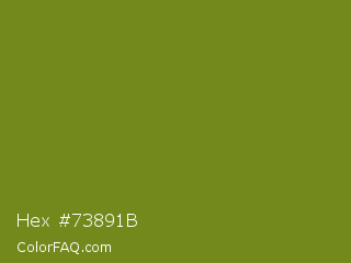 Hex #73891b Color is a normal lime color and the nearest color is Trendy Green #7c881a. Hex code #73891b and RGB value is rgb(115,137,27). In RGB color space, this color is composed of 45% red, 54% green, 11% blue, In CMYK color space, this color is composed of 16% cyan, 0% magenta, 80% yellow , 46% black , In HSL color space, this color has a hue angle of 72° , 67% saturation and 32% lightness.
