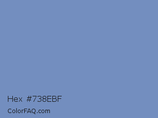 Hex #738ebf Color is a normal blue color and the nearest color is Ship Cove #788bba. Hex code #738ebf and RGB value is rgb(115,142,191). In RGB color space, this color is composed of 45% red, 56% green, 75% blue, In CMYK color space, this color is composed of 40% cyan, 26% magenta, 0% yellow , 25% black , In HSL color space, this color has a hue angle of 219° , 37% saturation and 60% lightness.