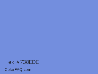 Hex #738ede Color is a light blue color and the nearest color is Vista Blue #7c9ed9. Hex code #738ede and RGB value is rgb(115,142,222). In RGB color space, this color is composed of 45% red, 56% green, 87% blue, In CMYK color space, this color is composed of 48% cyan, 36% magenta, 0% yellow , 13% black , In HSL color space, this color has a hue angle of 225° , 62% saturation and 66% lightness.