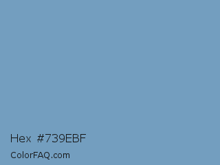 Hex #739ebf Color is a normal blue color and the nearest color is Air Superiority Blue #72a0c1. Hex code #739ebf and RGB value is rgb(115,158,191). In RGB color space, this color is composed of 45% red, 62% green, 75% blue, In CMYK color space, this color is composed of 40% cyan, 17% magenta, 0% yellow , 25% black , In HSL color space, this color has a hue angle of 206° , 37% saturation and 60% lightness.