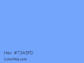 Hex #73a5fd Color is a light blue color and the nearest color is French Sky Blue #77b5fe. Hex code #73a5fd and RGB value is rgb(115,165,253). In RGB color space, this color is composed of 45% red, 65% green, 99% blue, In CMYK color space, this color is composed of 55% cyan, 35% magenta, 0% yellow , 1% black , In HSL color space, this color has a hue angle of 218° , 97% saturation and 72% lightness.