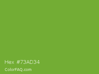 Hex #73ad34 Color is a normal green color and the nearest color is Green RYB #66b032. Hex code #73ad34 and RGB value is rgb(115,173,52). In RGB color space, this color is composed of 45% red, 68% green, 20% blue, In CMYK color space, this color is composed of 34% cyan, 0% magenta, 70% yellow , 32% black , In HSL color space, this color has a hue angle of 89° , 54% saturation and 44% lightness.