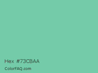 Hex #73cbaa Color is a light green color and the nearest color is Medium Aquamarine #66ddaa. Hex code #73cbaa and RGB value is rgb(115,203,170). In RGB color space, this color is composed of 45% red, 80% green, 67% blue, In CMYK color space, this color is composed of 43% cyan, 0% magenta, 16% yellow , 20% black , In HSL color space, this color has a hue angle of 158° , 46% saturation and 62% lightness.