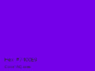 Hex #7400e9 Color is a normal violet color and the nearest color is Electric Indigo #6f00ff. Hex code #7400e9 and RGB value is rgb(116,0,233). In RGB color space, this color is composed of 45% red, 0% green, 91% blue, In CMYK color space, this color is composed of 50% cyan, 100% magenta, 0% yellow , 9% black , In HSL color space, this color has a hue angle of 270° , 100% saturation and 46% lightness.
