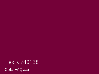 Hex #740138 Color is a dark rose color and the nearest color is Siren #7a013a. Hex code #740138 and RGB value is rgb(116,1,56). In RGB color space, this color is composed of 45% red, 0% green, 22% blue, In CMYK color space, this color is composed of 0% cyan, 99% magenta, 52% yellow , 55% black , In HSL color space, this color has a hue angle of 331° , 98% saturation and 23% lightness.