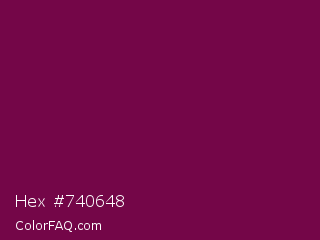 Hex #740648 Color is a dark magenta color and the nearest color is Rose Bud Cherry #800b47. Hex code #740648 and RGB value is rgb(116,6,72). In RGB color space, this color is composed of 45% red, 2% green, 28% blue, In CMYK color space, this color is composed of 0% cyan, 95% magenta, 38% yellow , 55% black , In HSL color space, this color has a hue angle of 324° , 90% saturation and 24% lightness.