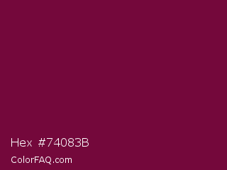 Hex #74083b Color is a dark rose color and the nearest color is Siren #7a013a. Hex code #74083b and RGB value is rgb(116,8,59). In RGB color space, this color is composed of 45% red, 3% green, 23% blue, In CMYK color space, this color is composed of 0% cyan, 93% magenta, 49% yellow , 55% black , In HSL color space, this color has a hue angle of 332° , 87% saturation and 24% lightness.