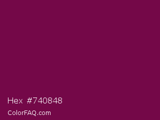 Hex #740848 Color is a dark magenta color and the nearest color is Rose Bud Cherry #800b47. Hex code #740848 and RGB value is rgb(116,8,72). In RGB color space, this color is composed of 45% red, 3% green, 28% blue, In CMYK color space, this color is composed of 0% cyan, 93% magenta, 38% yellow , 55% black , In HSL color space, this color has a hue angle of 324° , 87% saturation and 24% lightness.