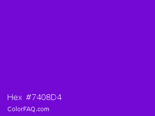 Hex #7408d4 Color is a normal purple color and the nearest color is French Violet #8806ce. Hex code #7408d4 and RGB value is rgb(116,8,212). In RGB color space, this color is composed of 45% red, 3% green, 83% blue, In CMYK color space, this color is composed of 45% cyan, 96% magenta, 0% yellow , 17% black , In HSL color space, this color has a hue angle of 272° , 93% saturation and 43% lightness.