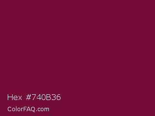 Hex #740b36 Color is a dark rose color and the nearest color is Siren #7a013a. Hex code #740b36 and RGB value is rgb(116,11,54). In RGB color space, this color is composed of 45% red, 4% green, 21% blue, In CMYK color space, this color is composed of 0% cyan, 91% magenta, 53% yellow , 55% black , In HSL color space, this color has a hue angle of 335° , 83% saturation and 25% lightness.