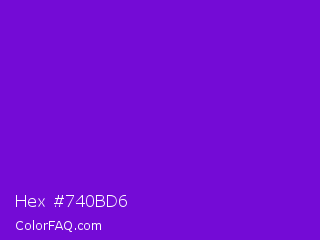Hex #740bd6 Color is a normal purple color and the nearest color is French Violet #8806ce. Hex code #740bd6 and RGB value is rgb(116,11,214). In RGB color space, this color is composed of 45% red, 4% green, 84% blue, In CMYK color space, this color is composed of 46% cyan, 95% magenta, 0% yellow , 16% black , In HSL color space, this color has a hue angle of 271° , 90% saturation and 44% lightness.