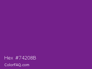 Hex #74208b Color is a normal purple color and the nearest color is Seance #731e8f. Hex code #74208b and RGB value is rgb(116,32,139). In RGB color space, this color is composed of 45% red, 13% green, 55% blue, In CMYK color space, this color is composed of 17% cyan, 77% magenta, 0% yellow , 45% black , In HSL color space, this color has a hue angle of 287° , 63% saturation and 34% lightness.