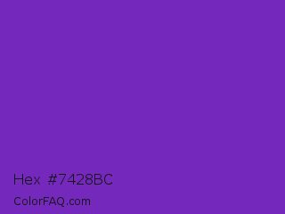 Hex #7428bc Color is a normal purple color and the nearest color is Purple Heart Crayola #652dc1. Hex code #7428bc and RGB value is rgb(116,40,188). In RGB color space, this color is composed of 45% red, 16% green, 74% blue, In CMYK color space, this color is composed of 38% cyan, 79% magenta, 0% yellow , 26% black , In HSL color space, this color has a hue angle of 271° , 65% saturation and 45% lightness.