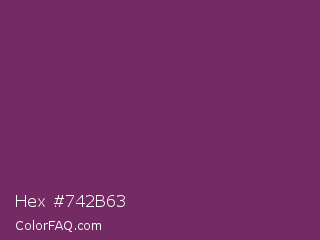 Hex #742b63 Color is a normal magenta color and the nearest color is Byzantium #702963. Hex code #742b63 and RGB value is rgb(116,43,99). In RGB color space, this color is composed of 45% red, 17% green, 39% blue, In CMYK color space, this color is composed of 0% cyan, 63% magenta, 15% yellow , 55% black , In HSL color space, this color has a hue angle of 314° , 46% saturation and 31% lightness.