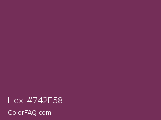 Hex #742e58 Color is a normal magenta color and the nearest color is Finn #692d54. Hex code #742e58 and RGB value is rgb(116,46,88). In RGB color space, this color is composed of 45% red, 18% green, 35% blue, In CMYK color space, this color is composed of 0% cyan, 60% magenta, 24% yellow , 55% black , In HSL color space, this color has a hue angle of 324° , 43% saturation and 32% lightness.
