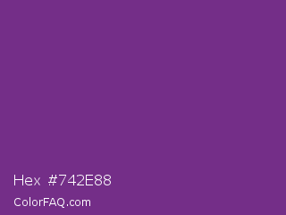 Hex #742e88 Color is a normal purple color and the nearest color is Maximum Purple #733380. Hex code #742e88 and RGB value is rgb(116,46,136). In RGB color space, this color is composed of 45% red, 18% green, 53% blue, In CMYK color space, this color is composed of 15% cyan, 66% magenta, 0% yellow , 47% black , In HSL color space, this color has a hue angle of 287° , 49% saturation and 36% lightness.