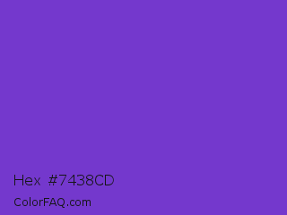 Hex #7438cd Color is a normal violet color and the nearest color is Purple Heart Crayola #652dc1. Hex code #7438cd and RGB value is rgb(116,56,205). In RGB color space, this color is composed of 45% red, 22% green, 80% blue, In CMYK color space, this color is composed of 43% cyan, 73% magenta, 0% yellow , 20% black , In HSL color space, this color has a hue angle of 264° , 60% saturation and 51% lightness.