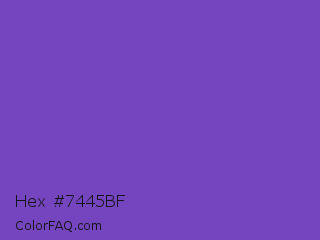 Hex #7445bf Color is a normal violet color and the nearest color is Studio #714ab2. Hex code #7445bf and RGB value is rgb(116,69,191). In RGB color space, this color is composed of 45% red, 27% green, 75% blue, In CMYK color space, this color is composed of 39% cyan, 64% magenta, 0% yellow , 25% black , In HSL color space, this color has a hue angle of 263° , 49% saturation and 51% lightness.