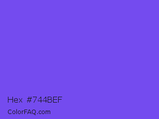Hex #744bef Color is a light indigo color and the nearest color is Majorelle Blue #6050dc. Hex code #744bef and RGB value is rgb(116,75,239). In RGB color space, this color is composed of 45% red, 29% green, 94% blue, In CMYK color space, this color is composed of 51% cyan, 69% magenta, 0% yellow , 6% black , In HSL color space, this color has a hue angle of 255° , 84% saturation and 62% lightness.