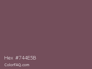 Hex #744e5b Color is a normal rose color and the nearest color is Ferra #704f50. Hex code #744e5b and RGB value is rgb(116,78,91). In RGB color space, this color is composed of 45% red, 31% green, 36% blue, In CMYK color space, this color is composed of 0% cyan, 33% magenta, 22% yellow , 55% black , In HSL color space, this color has a hue angle of 339° , 20% saturation and 38% lightness.