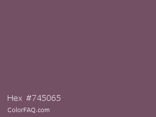Hex #745065 Color is a normal magenta color and the nearest color is Russett #755a57. Hex code #745065 and RGB value is rgb(116,80,101). In RGB color space, this color is composed of 45% red, 31% green, 40% blue, In CMYK color space, this color is composed of 0% cyan, 31% magenta, 13% yellow , 55% black , In HSL color space, this color has a hue angle of 325° , 18% saturation and 38% lightness.