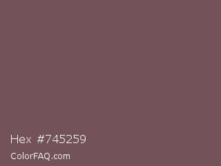 Hex #745259 Color is a normal red color and the nearest color is Russett #755a57. Hex code #745259 and RGB value is rgb(116,82,89). In RGB color space, this color is composed of 45% red, 32% green, 35% blue, In CMYK color space, this color is composed of 0% cyan, 29% magenta, 23% yellow , 55% black , In HSL color space, this color has a hue angle of 348° , 17% saturation and 39% lightness.
