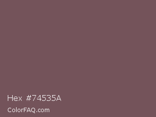 Hex #74535a Color is a normal red color and the nearest color is Russett #755a57. Hex code #74535a and RGB value is rgb(116,83,90). In RGB color space, this color is composed of 45% red, 33% green, 35% blue, In CMYK color space, this color is composed of 0% cyan, 28% magenta, 22% yellow , 55% black , In HSL color space, this color has a hue angle of 347° , 17% saturation and 39% lightness.