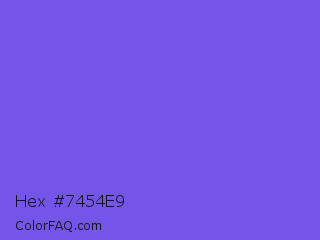 Hex #7454e9 Color is a light indigo color and the nearest color is Medium Slate Blue #7b68ee. Hex code #7454e9 and RGB value is rgb(116,84,233). In RGB color space, this color is composed of 45% red, 33% green, 91% blue, In CMYK color space, this color is composed of 50% cyan, 64% magenta, 0% yellow , 9% black , In HSL color space, this color has a hue angle of 253° , 77% saturation and 62% lightness.