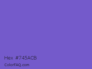 Hex #745acb Color is a normal indigo color and the nearest color is Slate Blue #6a5acd. Hex code #745acb and RGB value is rgb(116,90,203). In RGB color space, this color is composed of 45% red, 35% green, 80% blue, In CMYK color space, this color is composed of 43% cyan, 56% magenta, 0% yellow , 20% black , In HSL color space, this color has a hue angle of 254° , 52% saturation and 57% lightness.