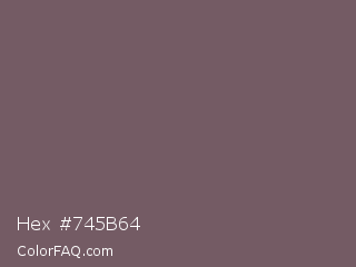 Hex #745b64 Color is a normal rose color and the nearest color is Deep Taupe #7e5e60. Hex code #745b64 and RGB value is rgb(116,91,100). In RGB color space, this color is composed of 45% red, 36% green, 39% blue, In CMYK color space, this color is composed of 0% cyan, 22% magenta, 14% yellow , 55% black , In HSL color space, this color has a hue angle of 338° , 12% saturation and 41% lightness.