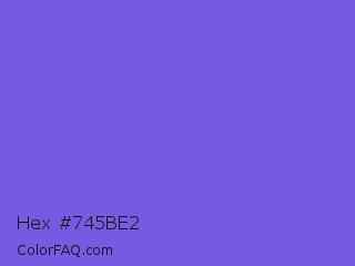 Hex #745be2 Color is a light indigo color and the nearest color is Medium Slate Blue #7b68ee. Hex code #745be2 and RGB value is rgb(116,91,226). In RGB color space, this color is composed of 45% red, 36% green, 89% blue, In CMYK color space, this color is composed of 49% cyan, 60% magenta, 0% yellow , 11% black , In HSL color space, this color has a hue angle of 251° , 70% saturation and 62% lightness.