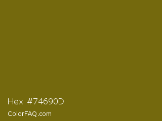 Hex #74690d Color is a dark yellow color and the nearest color is Spicy Mustard #74640d. Hex code #74690d and RGB value is rgb(116,105,13). In RGB color space, this color is composed of 45% red, 41% green, 5% blue, In CMYK color space, this color is composed of 0% cyan, 9% magenta, 89% yellow , 55% black , In HSL color space, this color has a hue angle of 54° , 80% saturation and 25% lightness.