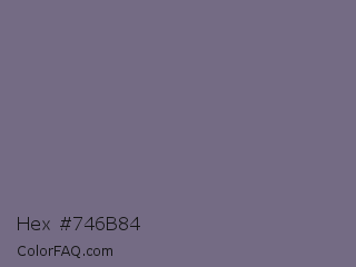 Hex #746b84 Color is a normal violet color and the nearest color is Rum #796989. Hex code #746b84 and RGB value is rgb(116,107,132). In RGB color space, this color is composed of 45% red, 42% green, 52% blue, In CMYK color space, this color is composed of 12% cyan, 19% magenta, 0% yellow , 48% black , In HSL color space, this color has a hue angle of 262° , 10% saturation and 47% lightness.