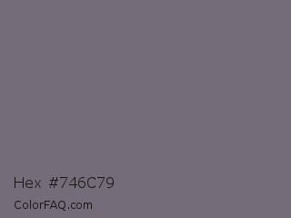 Hex #746c79 Color is a normal purple color and the nearest color is Fedora #796a78. Hex code #746c79 and RGB value is rgb(116,108,121). In RGB color space, this color is composed of 45% red, 42% green, 47% blue, In CMYK color space, this color is composed of 4% cyan, 11% magenta, 0% yellow , 53% black , In HSL color space, this color has a hue angle of 277° , 6% saturation and 45% lightness.
