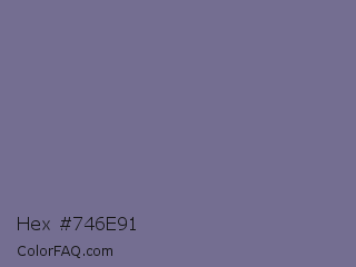 Hex #746e91 Color is a normal indigo color and the nearest color is Rhythm #777696. Hex code #746e91 and RGB value is rgb(116,110,145). In RGB color space, this color is composed of 45% red, 43% green, 57% blue, In CMYK color space, this color is composed of 20% cyan, 24% magenta, 0% yellow , 43% black , In HSL color space, this color has a hue angle of 250° , 14% saturation and 50% lightness.