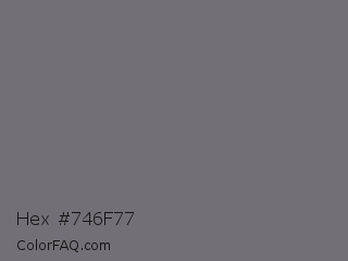 Hex #746f77 Color is a normal purple color and the nearest color is Sonic Silver #757575. Hex code #746f77 and RGB value is rgb(116,111,119). In RGB color space, this color is composed of 45% red, 44% green, 47% blue, In CMYK color space, this color is composed of 3% cyan, 7% magenta, 0% yellow , 53% black , In HSL color space, this color has a hue angle of 278° , 3% saturation and 45% lightness.