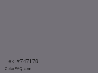 Hex #747178 Color is a normal violet color and the nearest color is Sonic Silver #757575. Hex code #747178 and RGB value is rgb(116,113,120). In RGB color space, this color is composed of 45% red, 44% green, 47% blue, In CMYK color space, this color is composed of 3% cyan, 6% magenta, 0% yellow , 53% black , In HSL color space, this color has a hue angle of 266° , 3% saturation and 46% lightness.