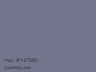 Hex #74758d Color is a normal blue color and the nearest color is Raven #727b89. Hex code #74758d and RGB value is rgb(116,117,141). In RGB color space, this color is composed of 45% red, 46% green, 55% blue, In CMYK color space, this color is composed of 18% cyan, 17% magenta, 0% yellow , 45% black , In HSL color space, this color has a hue angle of 238° , 10% saturation and 50% lightness.