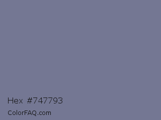 Hex #747793 Color is a normal blue color and the nearest color is Rhythm #777696. Hex code #747793 and RGB value is rgb(116,119,147). In RGB color space, this color is composed of 45% red, 47% green, 58% blue, In CMYK color space, this color is composed of 21% cyan, 19% magenta, 0% yellow , 42% black , In HSL color space, this color has a hue angle of 234° , 13% saturation and 52% lightness.