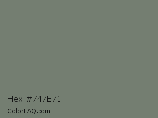 Hex #747e71 Color is a normal green color and the nearest color is Smoke #738276. Hex code #747e71 and RGB value is rgb(116,126,113). In RGB color space, this color is composed of 45% red, 49% green, 44% blue, In CMYK color space, this color is composed of 8% cyan, 0% magenta, 10% yellow , 51% black , In HSL color space, this color has a hue angle of 106° , 5% saturation and 47% lightness.
