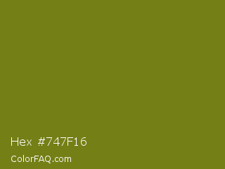 Hex #747f16 Color is a dark yellow color and the nearest color is Pacifika #778120. Hex code #747f16 and RGB value is rgb(116,127,22). In RGB color space, this color is composed of 45% red, 50% green, 9% blue, In CMYK color space, this color is composed of 9% cyan, 0% magenta, 83% yellow , 50% black , In HSL color space, this color has a hue angle of 66° , 70% saturation and 29% lightness.