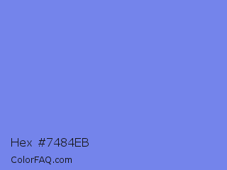 Hex #7484eb Color is a light blue color and the nearest color is Cornflower Blue #6495ed. Hex code #7484eb and RGB value is rgb(116,132,235). In RGB color space, this color is composed of 45% red, 52% green, 92% blue, In CMYK color space, this color is composed of 51% cyan, 44% magenta, 0% yellow , 8% black , In HSL color space, this color has a hue angle of 232° , 75% saturation and 69% lightness.