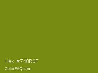 Hex #748b0f Color is a dark lime color and the nearest color is Trendy Green #7c881a. Hex code #748b0f and RGB value is rgb(116,139,15). In RGB color space, this color is composed of 45% red, 55% green, 6% blue, In CMYK color space, this color is composed of 17% cyan, 0% magenta, 89% yellow , 45% black , In HSL color space, this color has a hue angle of 71° , 81% saturation and 30% lightness.
