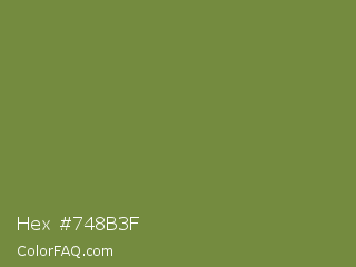 Hex #748b3f Color is a normal lime color and the nearest color is Palm Leaf #6f9940. Hex code #748b3f and RGB value is rgb(116,139,63). In RGB color space, this color is composed of 45% red, 55% green, 25% blue, In CMYK color space, this color is composed of 17% cyan, 0% magenta, 55% yellow , 45% black , In HSL color space, this color has a hue angle of 78° , 38% saturation and 40% lightness.