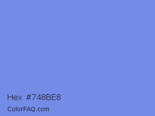 Hex #748be8 Color is a light blue color and the nearest color is Cornflower Blue #6495ed. Hex code #748be8 and RGB value is rgb(116,139,232). In RGB color space, this color is composed of 45% red, 55% green, 91% blue, In CMYK color space, this color is composed of 50% cyan, 40% magenta, 0% yellow , 9% black , In HSL color space, this color has a hue angle of 228° , 72% saturation and 68% lightness.